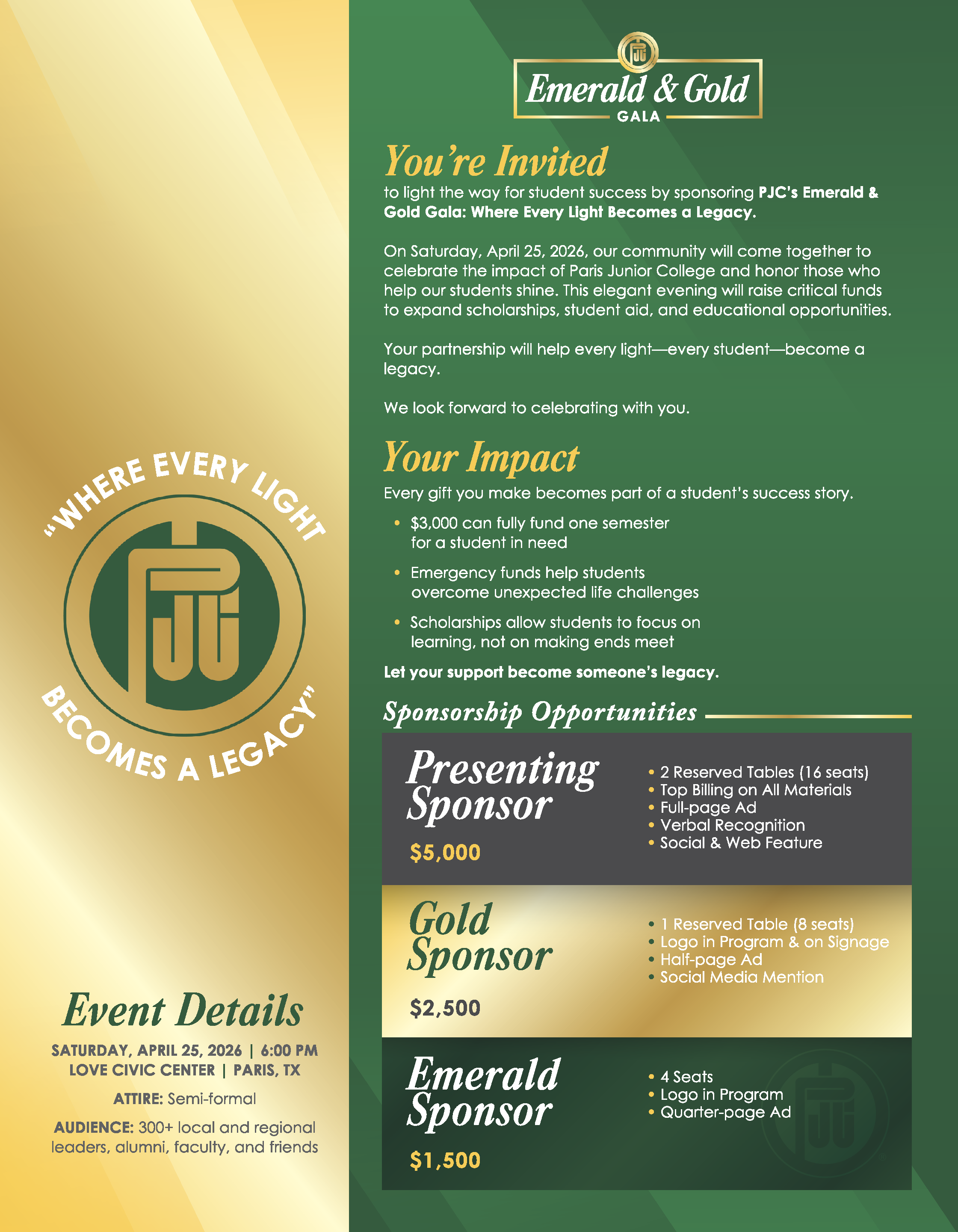 Gala sponsorships offer the opportunity to align your name or organization with student success while creating a visible, lasting impact at Paris Junior College.